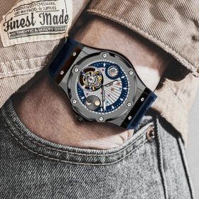 Looking to elevate your style? This watch is the ideal choice for you. Its exquisite design lends a stylish appearance and the shock-resistant feature ensures durability. The watch also boasts an attractive moon phase display. Crafted with a stainless steel case and a leather band strap, this mechanical timepiece exhibits an elegant design for added allure. It’s a watch that’s truly worth owning.